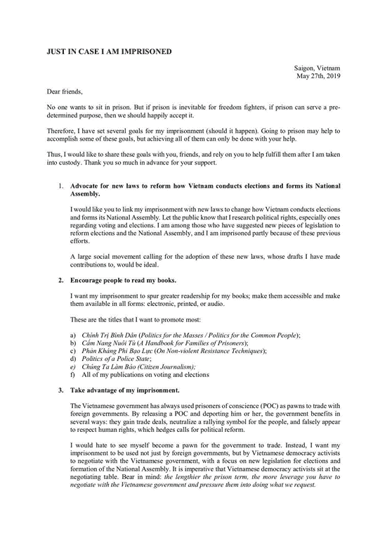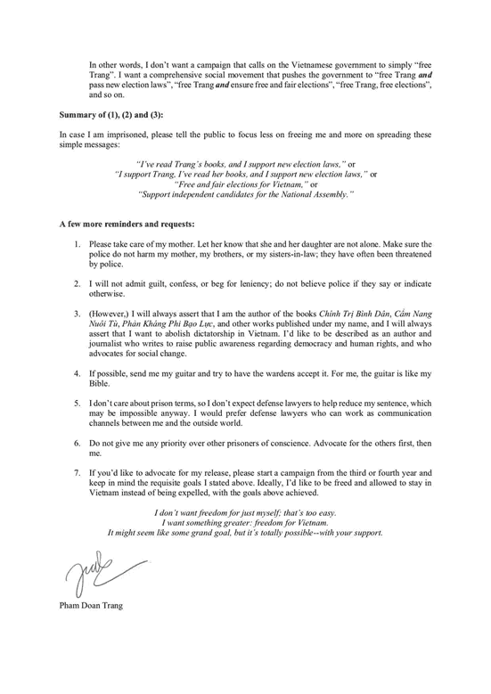 That would not be surprising. In fact, it is probably something she expected. A year ago, Trang had penned a letter titled “Just In Case I Am Imprisoned” (read the full letter, below) and sent it to a trusted friend with specific instructions to publish it the moment she gets arrested. She writes: “I don’t need freedom just for myself, that would be too easy. I want something much greater: freedom and democracy for all of Vietnam.”