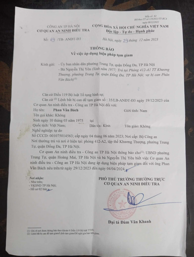 The arrest warrant for Phan Van Bach