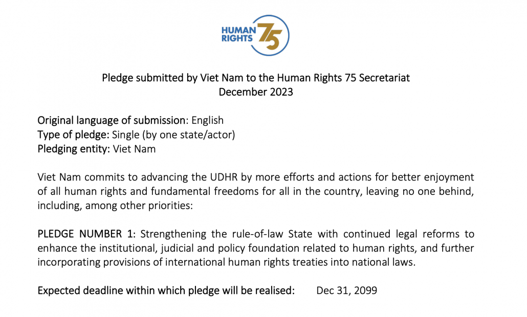 A screenshot of Vietnam’s original UN pledge, with self-made deadlines of 2099 to implement human rights goals