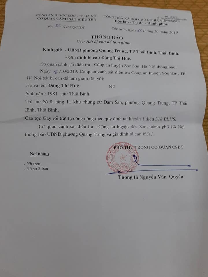 Facebooker Tran Thi Thu Thuy, a BOT protester who usually accompanied Hue to the protests and witnessed her arrest, reported that the public security of Soc Son District, Ha Noi, mobilized a powerful force to arrest Hue at 8:25 PM on October 16, 2019. They then took Hue to her house in Quang Trung District, Thai Binh City, Thai Binh Province, to be searched. One week after her arrest, Hue’s family still had not received any notification from Soc Son public security on her arrest. Her 15-year-old daughter, with the support of Thuy, only received a notice after going and requesting it from the communal public security office where Hue’s permanent residence is registered. In the notice, written on October 16 by the Soc Son Investigation Agency, Hue was accused of “disturbing public order,” the same accusation against Ha Van Nam. Her arrest took place only two days before the appeal trial against Ha Van Nam, scheduled on October 18, 2019.