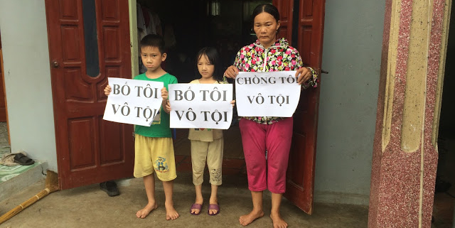 Ms. Nguyen Thi Lanh and their two children, holding signs saying “my husband/father is innocent.” Source: Huynh Ngoc Chenh blog