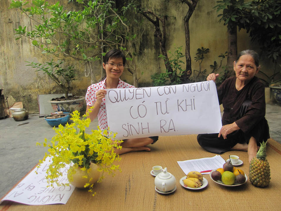 Hai Phong, 9 am, 5 May 2013: former political prisoner Pham Thanh Nghien and her mother in their back yard. The sign reads: “[We have] human rights since we were born.” (Source: Dan Lam Bao)
